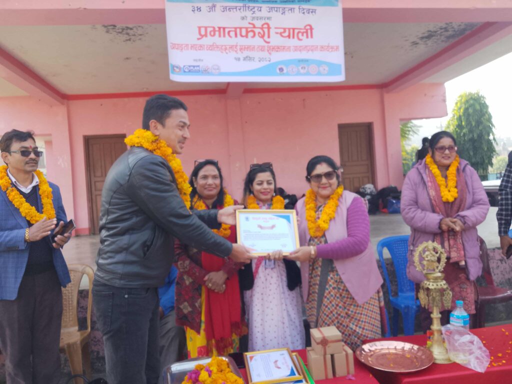 कार्यक्रममा अपांगता भएका र समाजमा प्रेरणादायी भूमिका निर्वाह गर्दै आएका किरण श्रेष्ठ, टिनु तामाङको उदाहरणीय जोडी तथा सफल उद्यमी इच्छे सार्कीलाई विशेष सम्मान दिइएको थियो ।